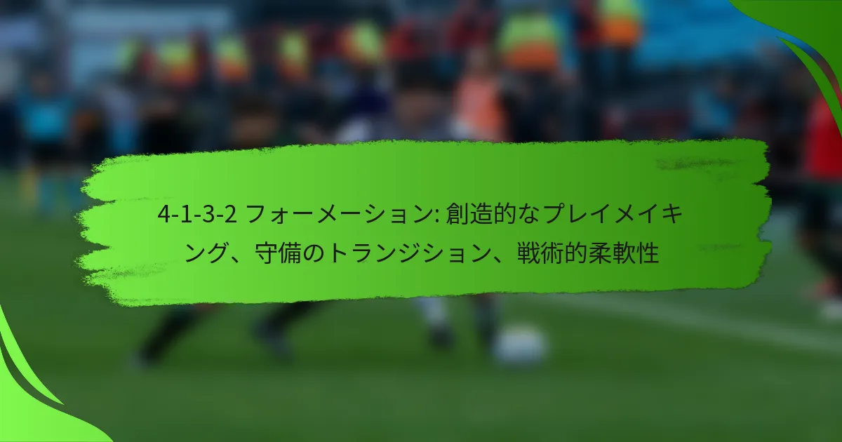 4-1-3-2フォーメーションは、創造的なプレーメイキングと守備の安定性をバランスよく兼ね備えたサッカーの多用途な戦術セットアップです。4人のディフェンダー、1人の守備的ミッドフィールダー、3人のセンターミッドフィールダー、2人のフォワードを組み込むことで、このフォーメーションは攻撃と守備の間の効果的な移行を促進し、チームが戦術的な柔軟性を維持し、フィールド上のスペースを活用できるようにします。